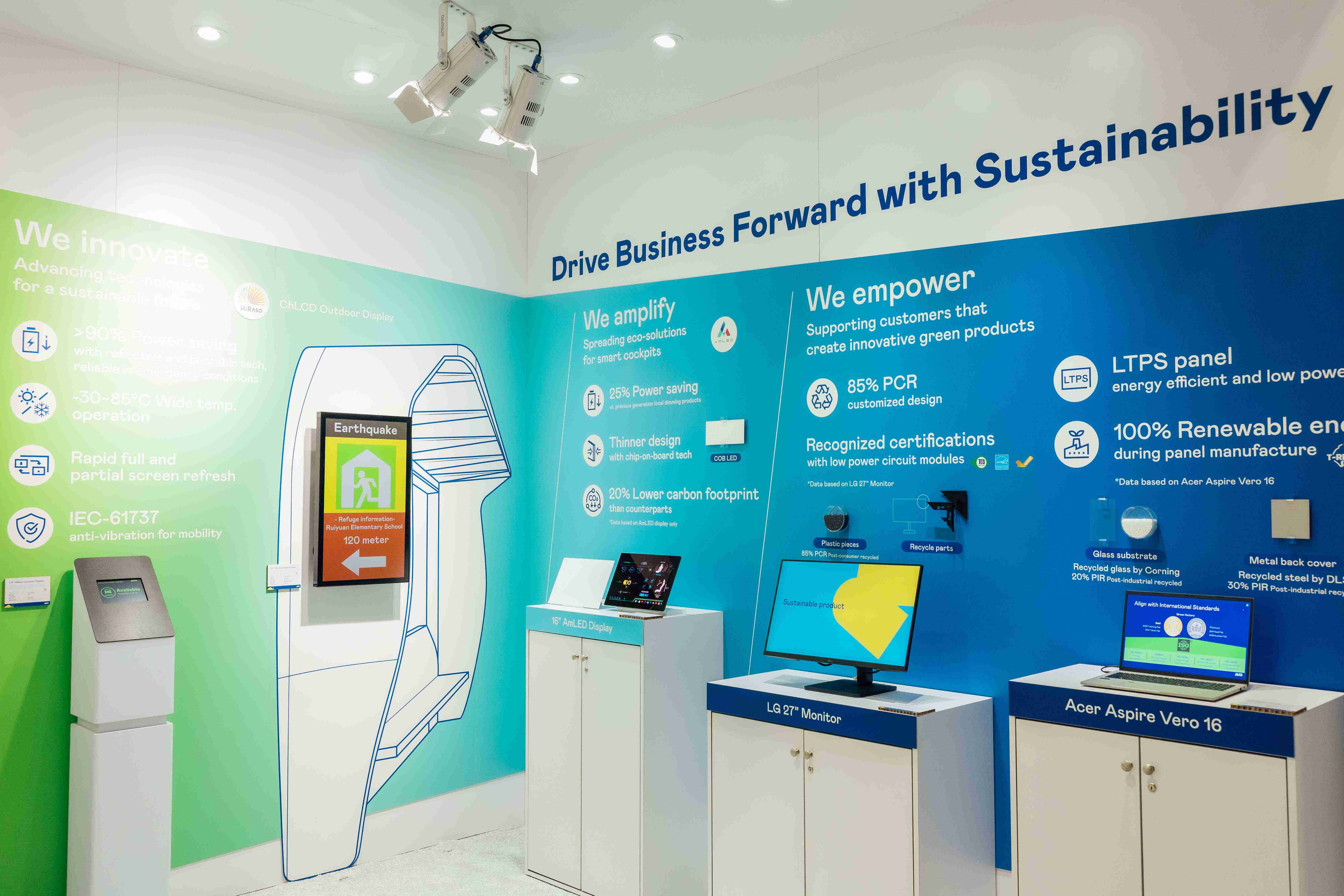28国际运用创新显示技术HiRaso胆固醇液晶双稳态技术达到显示零耗能、、、、扩大节能省电的AmLED显示技术应用于车用产品、、以再生的消费后回收(PCR)塑料及全绿电生产之面板,,,,应用于笔电及萤幕,,,增加绿色价值。。。。