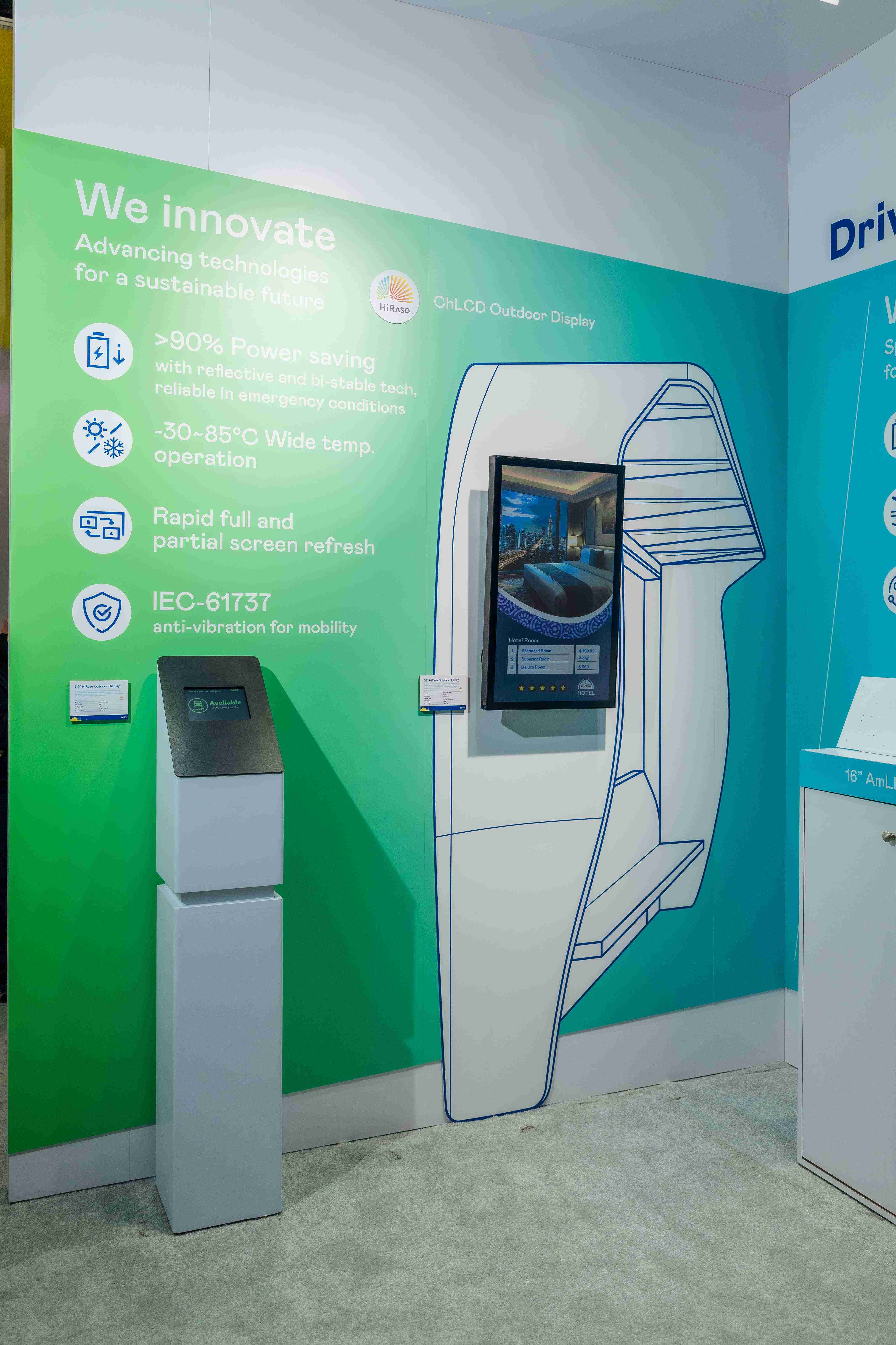 HiRaso胆固醇液晶显示器运用反射环境光线的方式,,呈现影像显示时零耗能的环保省电诉求,,,,光线愈强愈能呈现绝佳的色彩饱和度及显示效果,,同时在摄氏-30度至85度间宽温的使用优势,,,为户外电子看板的新首选。。