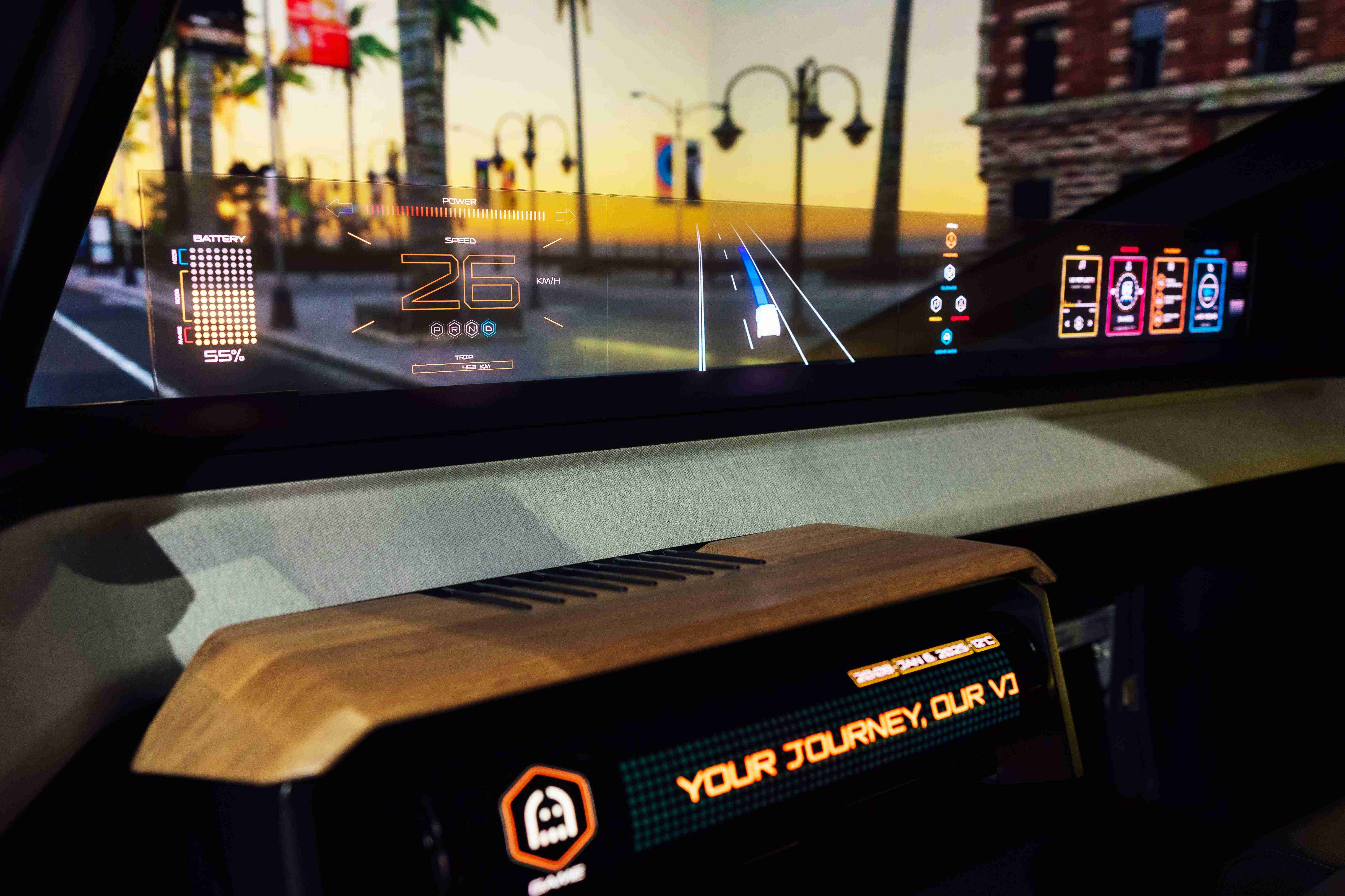 隐藏式智驾介面(Foldable Cruise Pilot)在不同模式下可以切换显示方式,,,,在手动驾驶模式时,,,显示器可以在半收合状态下,,仍呈现所需资讯;自驾模式时,,,显示器可以完全展开,,,,满足不同的多媒体娱乐需求。。。。 28国际Smart Cockpit 2025 在车头及车尾搭载合作伙伴Ennostar开发的互动式矩阵显示器(Interactive Matrix Display),,,,其突破传设计框架,,利用优化的光源整合技术,,,,提供更高亮度与对比度的显示效果,,,,营造驾车者个性化风格并传递讯息。。。
